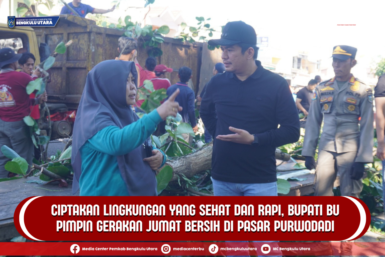 Ini merupakan bagian dari rangkaian penataan Pasar Purwodadi dalam mendukung Program Jumat Bersih. Hadir langsung Bupati Bengkulu Utara, Arie Septia Adinata, SE, MAP, bersama Sekretaris Daerah, para Asisten, PLN Arga Makmur, jajaran Kodim 0423/BU dan Polres Bengkulu Utara serta kepala perangkat daerah beserta jajaran ASN dan non-ASN lingkup Pemkab Bengkulu Utara,