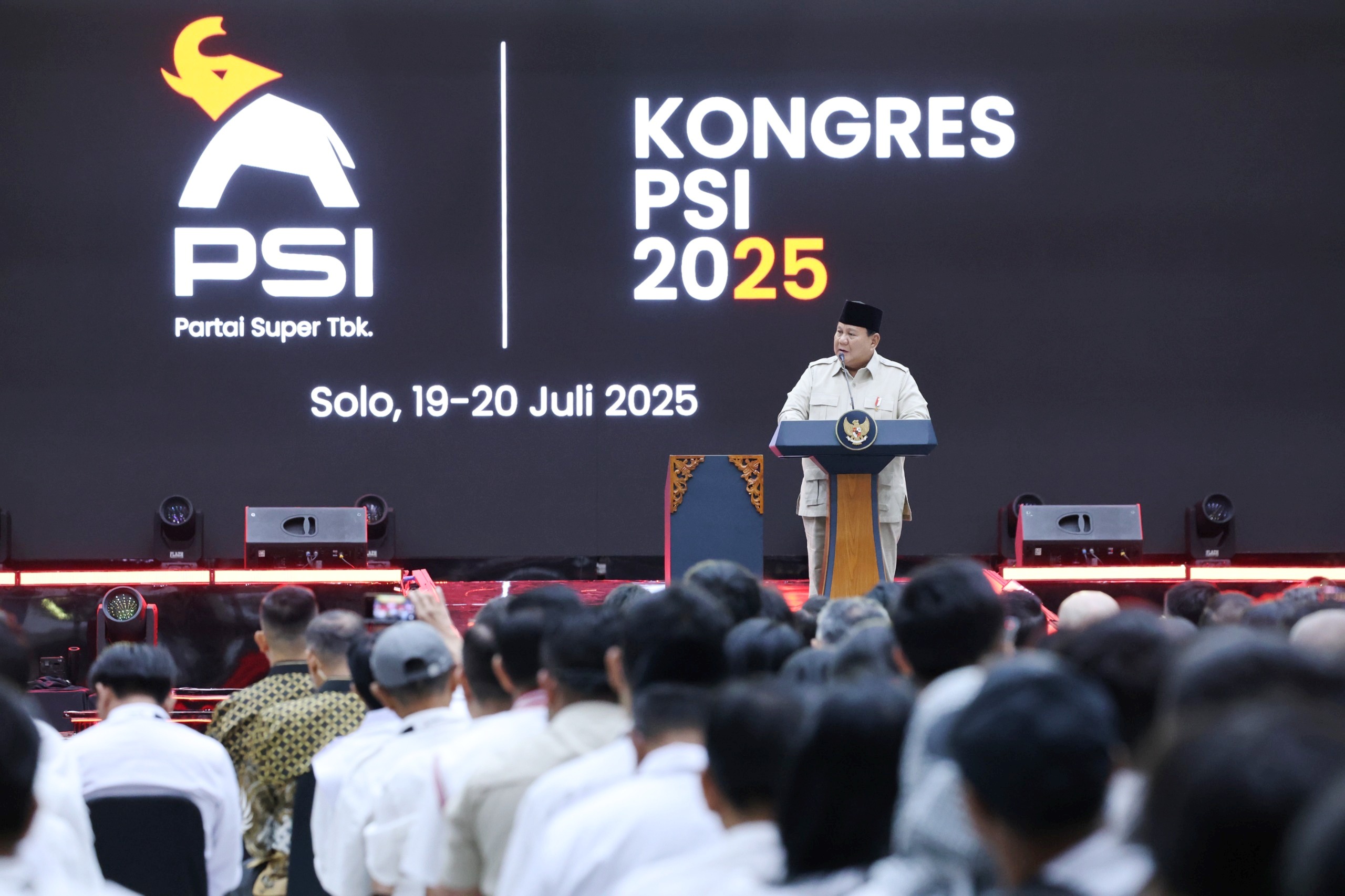 Presiden Prabowo Subianto berpidato di depan kader PSI saat penutupan kongres di Solo, Minggu, 20 Juli 2025. -Setpres---